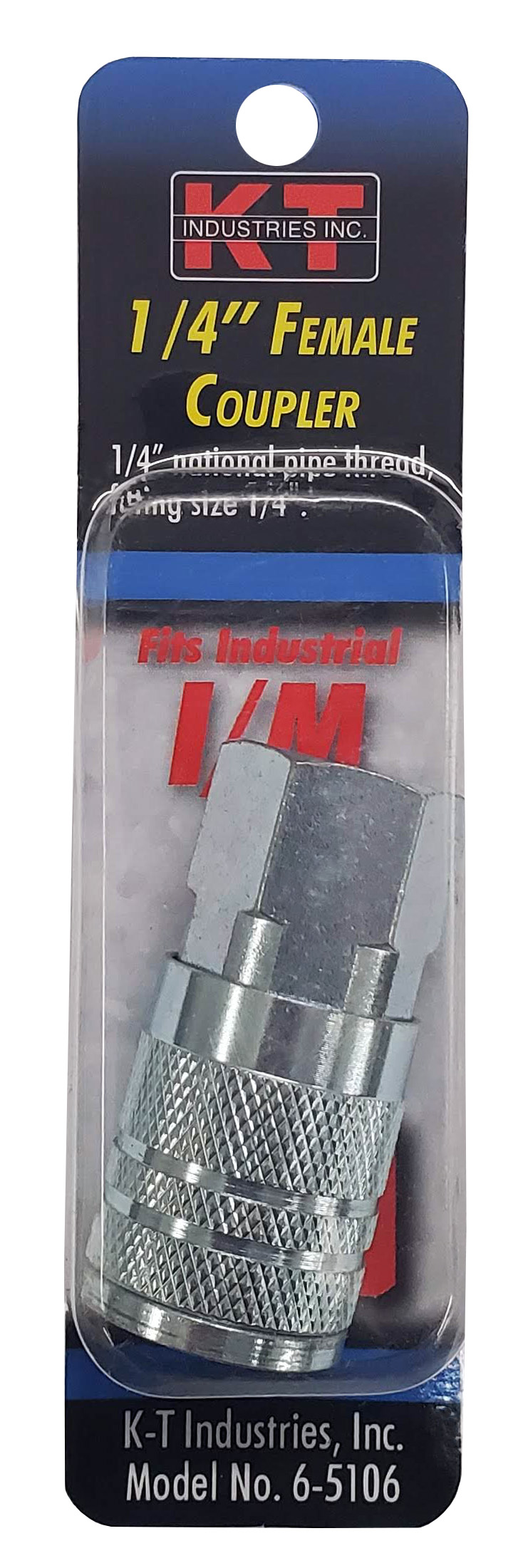 1/4" female national pipe thread 1/4" coupler. Interchangable with most Automotive Standard series couplers and plugs produced by other manufacturers. Features zinc plated solid brass bodies and sleeves with stainless steel springs, hardened steel locking balls and valves, and Buna-N (Nitrile) seals. Precision machined bar stock construction provides resistance to the effects of mechanical shock in rugged applications.